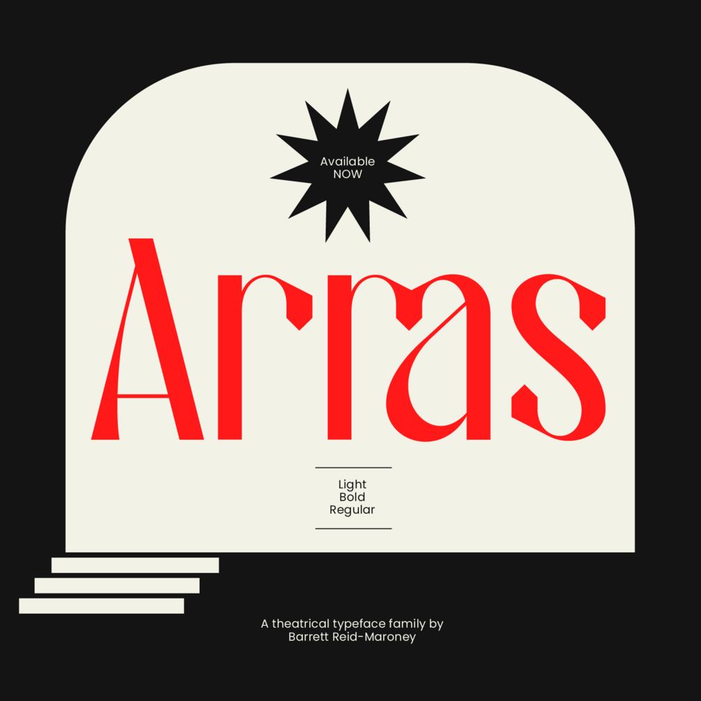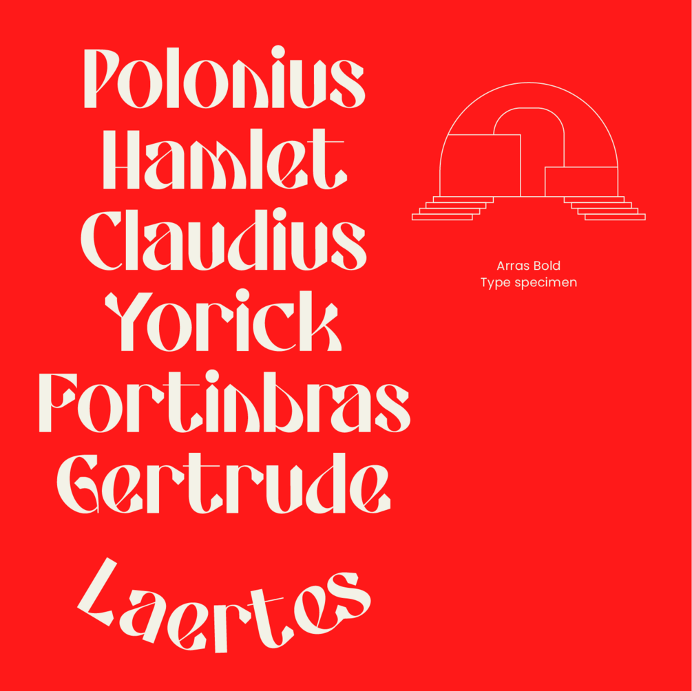 Arras, which takes its name from the theatrical device of the stage curtain, attempts to draw connections between the architecture of the stage and the architecture of letterforms. Arras is a profoundly theatrical typeface, featuring elements that resemble the space of the tiring house in Shakespeare’s Globe Theatre.